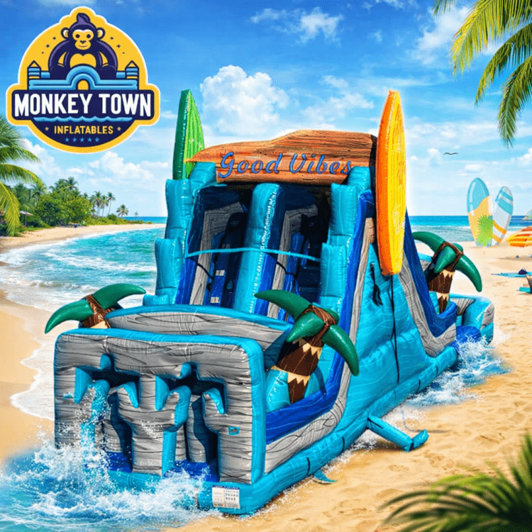 Level up your event with the 18ft Good Vibes Slide — the ultimate wave-maker in light blue with surfboards, dual lanes, and high-energy action from top to bottom! π― With a massive wall climb, built-in mini obstacle zone, and side-by-side racing lanes, this isn’t just a slide — it’s a full-on adventure. π₯